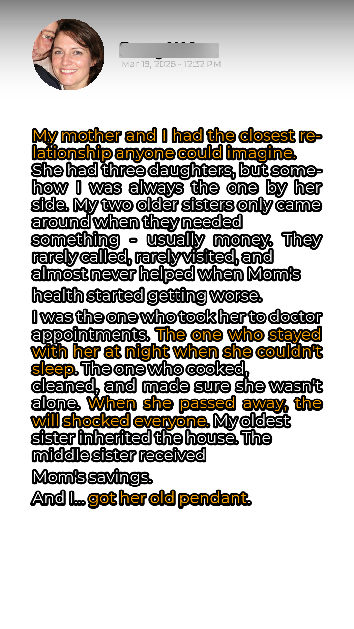 The injustice of it all burned within me. I couldn’t understand how my mother, who I believed knew my heart, could seemingly dismiss my efforts in such a callous manner. I felt betrayed, undervalued, and deeply hurt. As my sisters celebrated their inheritances, I retreated into my own grief, clutching the pendant in my hand, searching for answers that seemed impossible to find.