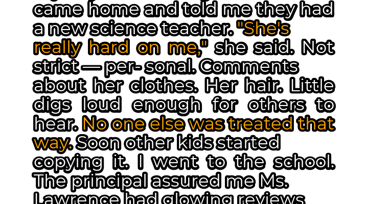 The impact was immediate. Parents gasped, students whispered, and the principal looked as though he might faint. Ms. Lawrence was escorted from the room, her career hanging by a thread. The next day, I received a call from the school board informing me that Ms. Lawrence had been placed on administrative leave pending an investigation. Shortly after, she resigned. Lizzie, initially mortified, slowly began to heal. The other students, witnessing the consequences of their actions, apologized for their behavior. The school implemented a new anti-bullying program, and Lizzie, finally free from Ms. Lawrence’s shadow, thrived. She went on to excel in science, fueled by a newfound confidence and a determination to never let anyone dim her light again. While the scars of the past may never fully disappear, that night I stood up for my daughter, and in doing so, I finally stood up for myself.