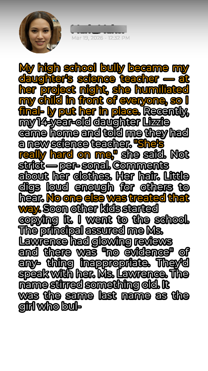 It had been over twenty years since I last saw Sarah Lawrence, but the memory of her sneering face was etched into my mind like a brand. High school had been a daily gauntlet of her petty cruelties, her relentless teasing, and her uncanny ability to turn others against me. I had thought those days were long behind me, buried deep in the past. But now, here she was, Ms. Lawrence, my daughter’s science teacher, and the nightmare was starting all over again. Lizzie, my bright, sensitive daughter, was wilting under the pressure. She loved science, but Ms. Lawrence’s class had become a source of anxiety and dread. The comments started subtly – a critique of her outfit, a remark about her hairstyle, always delivered with a saccharine smile that masked the venom beneath. But soon, the other kids picked up on it, mimicking Ms. Lawrence’s behavior, isolating Lizzie and making her the target of their own juvenile taunts.