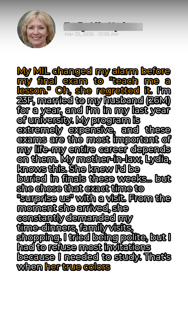 **Imagine your future hanging by a thread, years of hard work culminating in one single exam… then, your MOTHER-IN-LAW decides to “teach you a lesson” by sabotaging it all.** I’m talking about deliberately messing with the one thing standing between me and my dream career. Can you believe the audacity? She knew how much this meant to me, how much money and effort I’d poured into my education. Yet, she saw fit to play games with my future, all because I couldn’t drop everything to entertain her unexpected visit. The nerve of some people! I politely declined her invitations to dinners and shopping trips, prioritizing my studies above all else. That’s when she decided to take matters into her own hands, sneak into my room, and [TEXT] CHANGE MY ALARM TO A SONG I HATE AT 3 AM, MAKING ME COMPLETELY MISS MY 9 AM EXAM. [/TEXT]