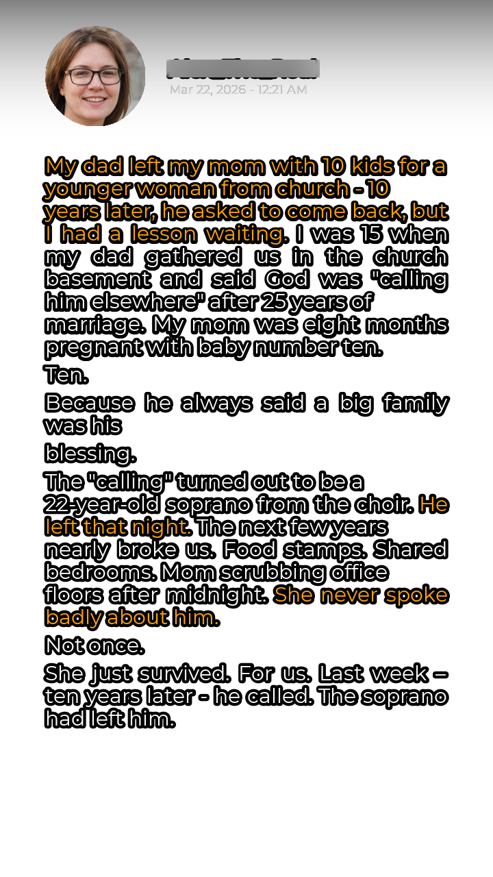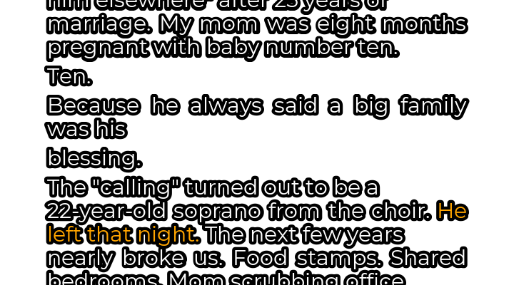 The truth, as it always does, eventually surfaced. His “calling” was a 22-year-old woman from the church choir, a soprano with a voice as sweet as her intentions were sour. He left that very night, packing a suitcase and taking with him not only his belongings but also the security and stability we had always taken for granted. The following years were a blur of hardship and struggle. We were plunged into a world of food stamps, hand-me-down clothes, and shared bedrooms. My mother, a woman who had dedicated her life to raising her children, was forced to take on back-breaking work, scrubbing office floors late into the night to keep a roof over our heads.