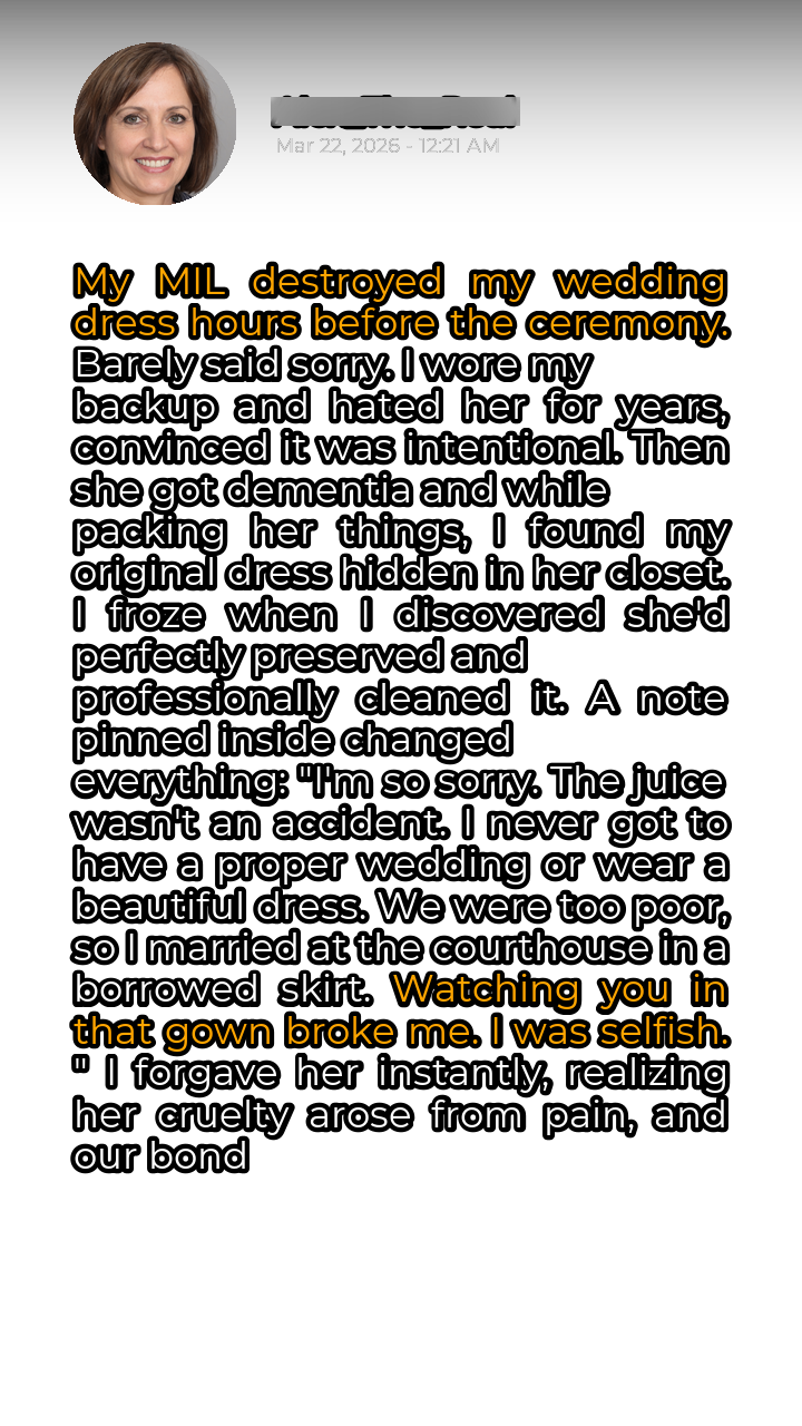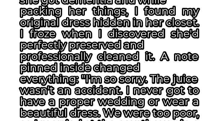 Pinned to the dress was a small, yellowed note, its edges frayed with age. With trembling hands, I unfolded it and began to read. The words, scrawled in my mother-in-law’s unmistakable handwriting, hit me like a tidal wave. “I’m so sorry,” it began. “The juice wasn’t an accident. I never got to have a proper wedding or wear a beautiful dress. We were too poor, so I married at the courthouse in a borrowed skirt. Watching you in that gown broke me. I was selfish.”