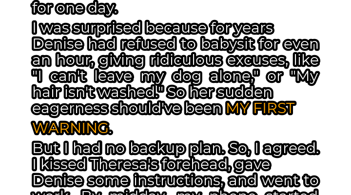 Against my better judgment, I agreed. I kissed Theresa’s forehead, gave Denise a detailed list of instructions – medication times, favorite cartoons, emergency contact numbers – and went to work, a knot of unease tightening in my stomach. I tried to shake it off, telling myself I was just being paranoid. After all, she was family. As I drove to work, I replayed the conversation with Denise in my head, searching for any clue, any hint of what might be behind this sudden change of heart. Was she lonely? Was she trying to make amends for years of indifference? Or was something far more sinister at play?