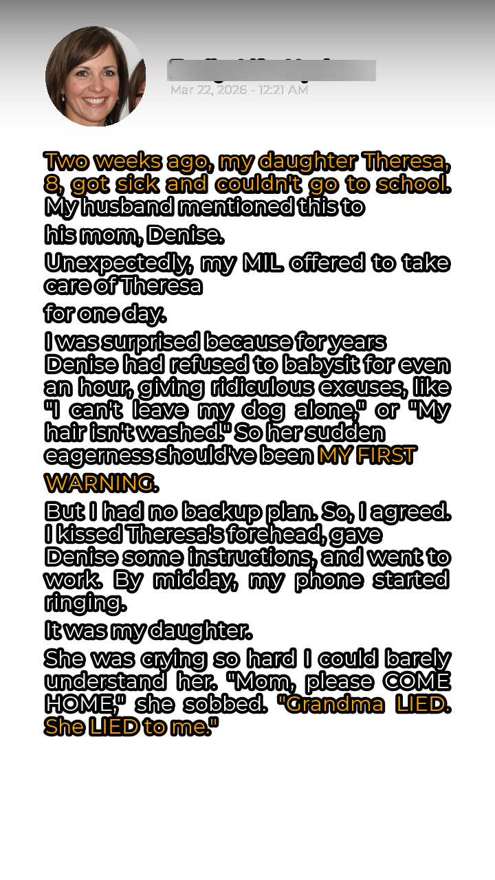 Two weeks ago, my daughter Theresa, a bright and bubbly eight-year-old, woke up with a fever and a nasty cough. It was clear she wouldn’t be going to school. My husband, bless his heart, mentioned this to his mother, Denise, during their usual Sunday phone call. What happened next completely blindsided me. Unexpectedly, and I mean completely out of the blue, my mother-in-law offered to take care of Theresa for the day. This was unprecedented. For years, Denise had steadfastly refused to babysit, even for a single hour. Her excuses were legendary in their absurdity: “I can’t leave my dog alone,” she’d claim, even though she had a dog walker. Or, “My hair isn’t washed; I can’t possibly be seen in public.” The list went on and on.