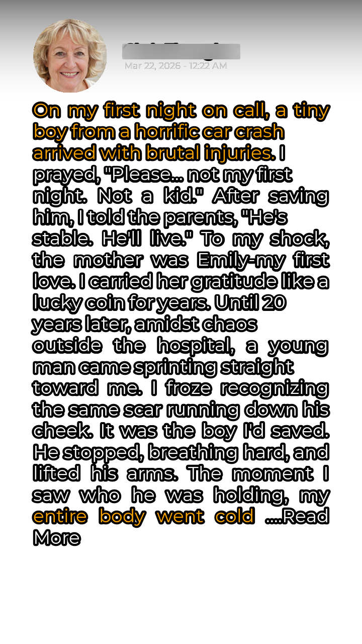 Twenty years passed. The memory of that night had faded somewhat, relegated to a quiet corner of my mind. I had built a successful career, saved countless lives, and found a sense of fulfillment in my work. But destiny, it seemed, had one more twist in store. One afternoon, as I was leaving the hospital after a particularly grueling shift, chaos erupted outside. Sirens wailed, and a crowd of people surged toward the entrance. Amidst the confusion, a young man came sprinting straight toward me.