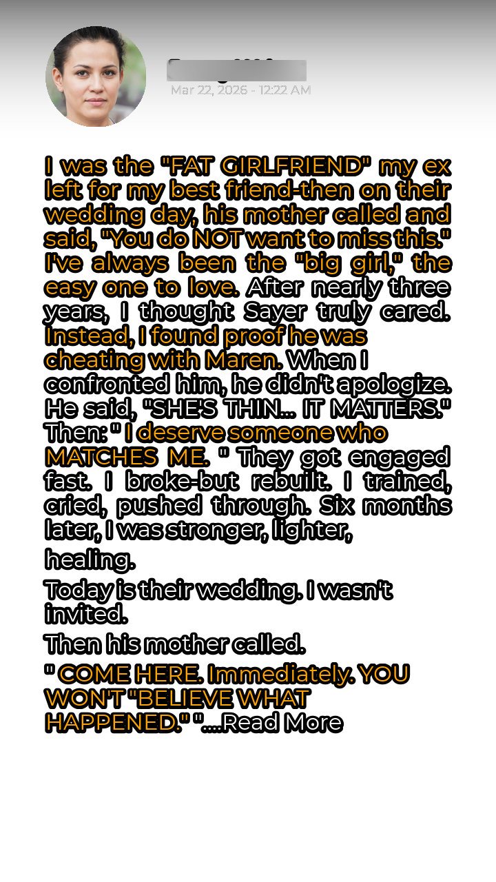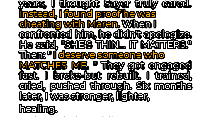 I had always been comfortable in my own skin, but society wasn’t. Being labeled the “fat girlfriend” stung, even though I knew Sayer loved me – or so I thought. Our relationship had been a whirlwind of laughter, shared dreams, and comfortable silences. We’d spent countless nights binge-watching movies, exploring new restaurants, and building a life together. I truly believed we were soulmates. Then came the day I stumbled upon the text messages. My heart sank as I scrolled through the illicit conversations between Sayer and Maren, my supposed best friend. The words were laced with flirtation, promises, and a blatant disregard for my existence. When I confronted Sayer, his response was even more devastating than the betrayal itself. He didn’t deny the affair. Instead, he spewed venomous words, claiming Maren was his ideal match because she was thin and “desirable.” The statement, “**I deserve someone who MATCHES ME,**” echoed in my mind, shattering my self-esteem and leaving me feeling worthless.