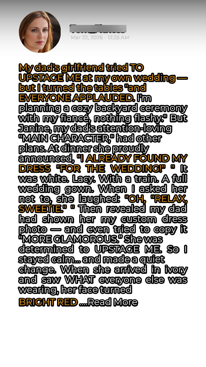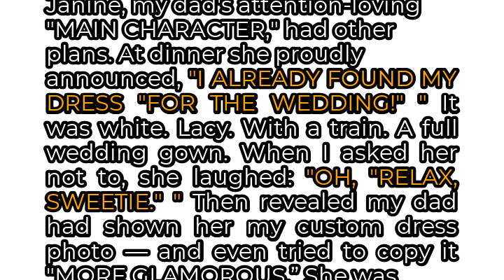My wedding was meant to be a celebration of love, a cozy gathering of close friends and family in my backyard. My fiancé, Mark, and I had envisioned a relaxed atmosphere, filled with laughter and genuine connection. We weren’t aiming for extravagance; we wanted something simple and heartfelt. However, my dad’s girlfriend, Janine, a woman who thrives on attention, had other plans. From the moment she entered our lives, she’d made it clear that she considered herself the “main character” in every situation. The first sign of trouble came during a casual dinner a few weeks before the wedding. Janine, with a flourish, announced to the table that she had found “the perfect dress” for the occasion. Her eyes sparkled with self-satisfaction as she described it in detail. My heart sank as she revealed the color: white. Not a subtle ivory or a gentle cream, but a stark, undeniable white. To add insult to injury, she explained that it was a full-length, lace-covered gown with a train – essentially a wedding dress.