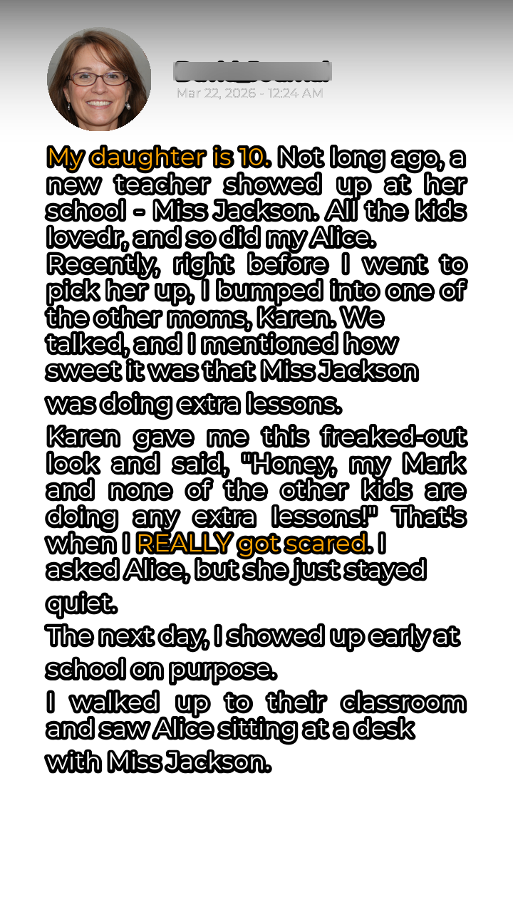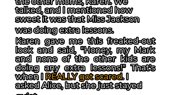 We were chatting near the school gates as we waited for our kids when I casually mentioned how grateful I was that Miss Jackson was giving Alice extra attention. Karen’s face twisted into a look of confusion and concern. “Extra lessons?” she asked, her voice laced with disbelief. “My Mark isn’t getting any extra lessons, and I haven’t heard any of the other parents mention it either.”