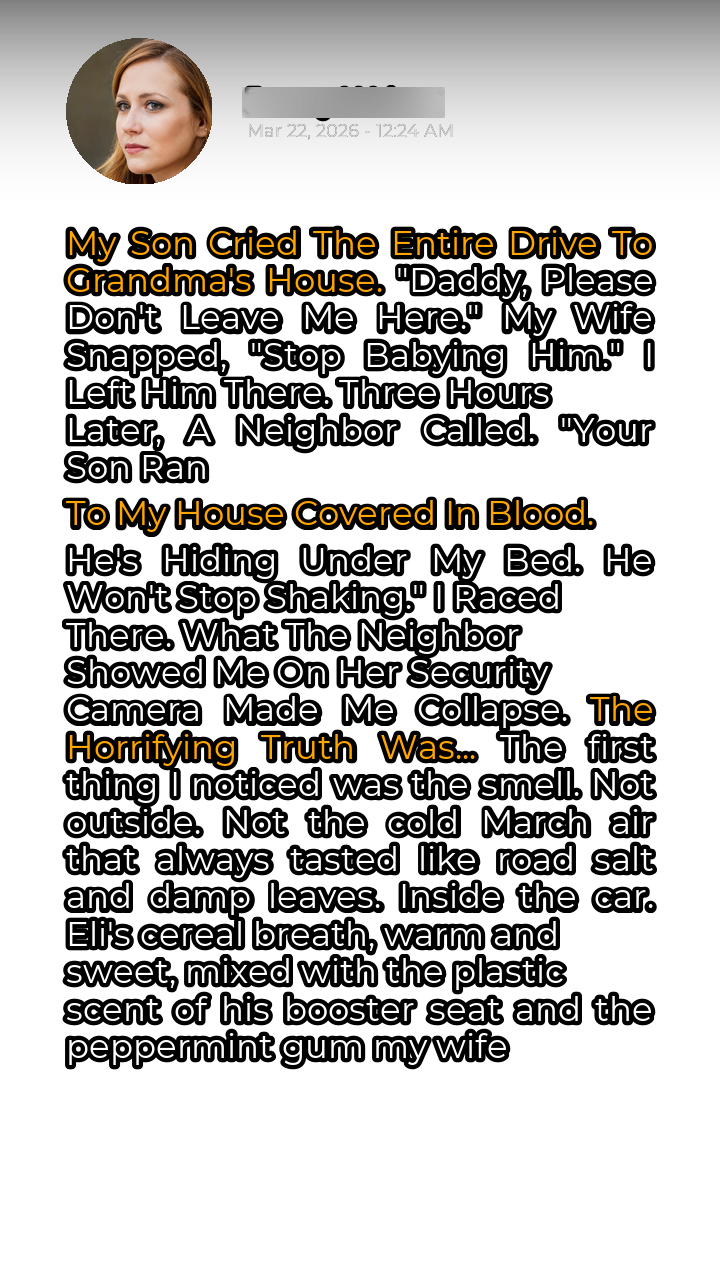 The first thing I noticed was the smell. Not outside. Not the cold March air that always tasted like road salt and damp leaves. Inside the car. Eli’s cereal breath, warm and sweet, mixed with the plastic scent of his booster seat and the peppermint gum my wife chewed incessantly. But underneath it all, a cloying sweetness I couldn’t quite place. It clung to the air, a phantom scent of something unnatural. The drive to Sarah’s mother’s house was always fraught with tension. Not because of the distance – it was only a little over an hour – but because of the destination. My mother-in-law, Agnes, was…difficult. She had never truly approved of me, always hinting that Sarah could have done better, married someone with more ambition, more money, more…something. Eli, however, adored her. Or at least, he used to. Lately, he’d become increasingly withdrawn whenever we mentioned visiting her.