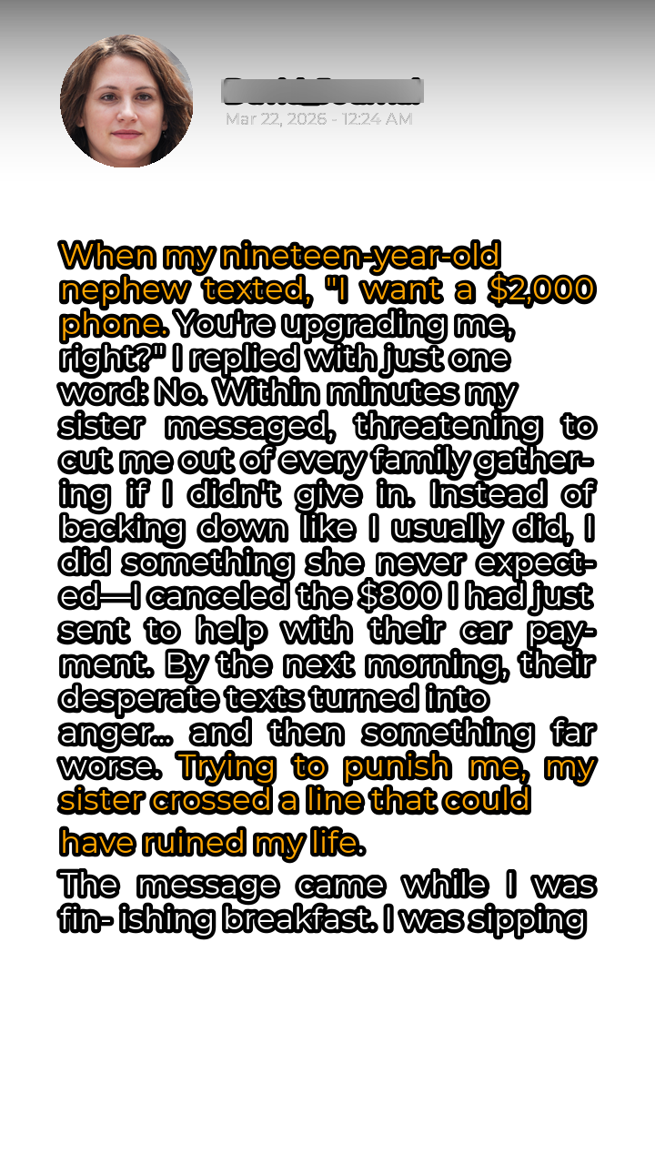 The text arrived just as I was savoring my morning coffee, a rare moment of peace before the chaos of the day began. It was a screenshot from my sister, a string of increasingly frantic messages from my nephew demanding a new phone, specifically one that cost a staggering $2,000. His logic? I was due for an upgrade myself, so naturally, I should pass my old phone down to him and purchase this extravagant device for him. My single-word reply, “No,” felt incredibly liberating, a small act of defiance against years of family expectations. However, my newfound freedom was short-lived. Within minutes, my phone buzzed again – this time a barrage of texts from my sister. Her tone was a masterful blend of guilt-tripping and outright threats. She accused me of being selfish, of not caring about my nephew’s happiness, and, most dramatically, of risking my place in the family. She vowed to exclude me from every holiday, birthday, and family event if I didn’t give in to her son’s demand. I had always been the peacemaker, the one who smoothed things over, the one who often sacrificed my own needs to keep the family harmony. But this felt different. This felt like extortion.