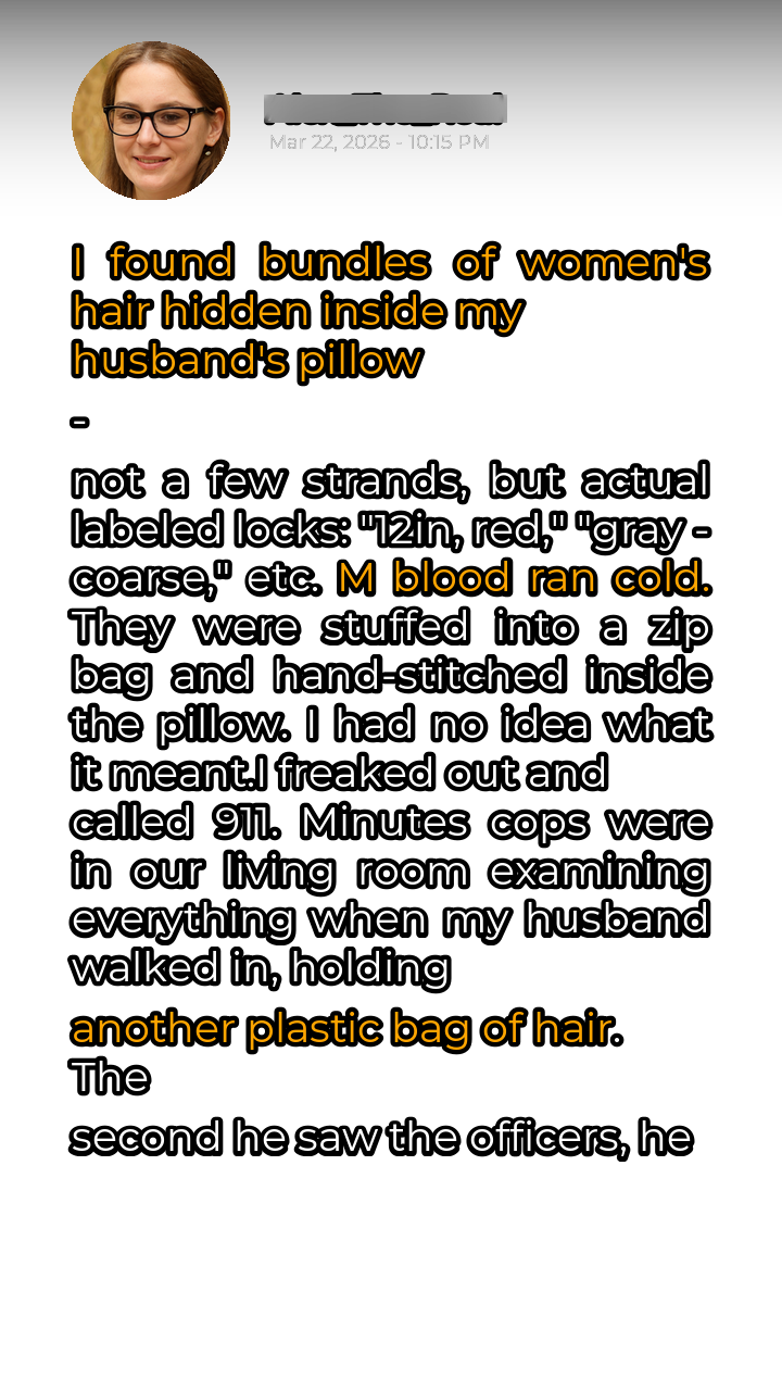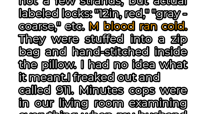 Panic seized me. My hands trembled as I fumbled for my phone and dialed 911. I couldn’t explain the situation rationally; all I knew was that I felt unsafe, violated. Within minutes, two police officers arrived at our home, their expressions a mixture of concern and professional detachment. I led them to the bedroom, my voice shaking as I explained my discovery. They examined the pillow, their faces growing increasingly grim as they pulled out the bundles of hair, carefully placing them into evidence bags.