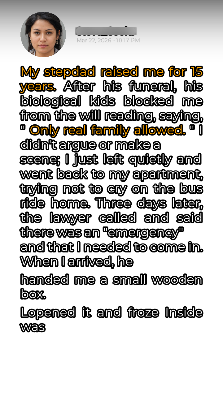 The weight of the rejection hit Sarah harder than she’d anticipated. Fifteen years. Fifteen years of scraped knees, bedtime stories, graduations, and quiet talks. Fifteen years of calling him “Dad.” Now, standing outside the lawyer’s office after the funeral, the words “Only real family allowed” echoed in her mind, a cruel mantra of exclusion. She hadn’t argued, hadn’t pleaded. What was the point? Grief and disbelief had rendered her silent, a ghost at her own father’s farewell. The bus ride home was a blur of unshed tears and stifled sobs. Back in her small apartment, Sarah tried to make sense of the void. John, her stepdad, had been more of a father to her than her biological dad ever was. He’d stepped in when she was just a toddler, her own father a fleeting memory. John had taught her to ride a bike, helped her with her homework, and walked her down the aisle at her high school graduation. He was there for every milestone, every heartbreak, every triumph. Now, he was gone, and his biological children, strangers really, had erased her from his life’s final chapter.