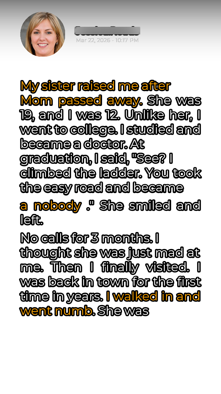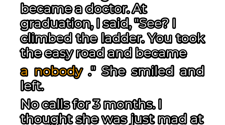 Standing on that stage, diploma in hand, I spotted Sarah in the crowd, her face radiant with pride. In that moment, instead of gratitude, a wave of arrogance washed over me. I sought her out after the ceremony and, in a moment of breathtaking callousness, I uttered words that would forever haunt me: “See? I climbed the ladder. You took the easy road and became a nobody.” Her smile faltered, a flicker of pain crossing her face before she simply turned and walked away.