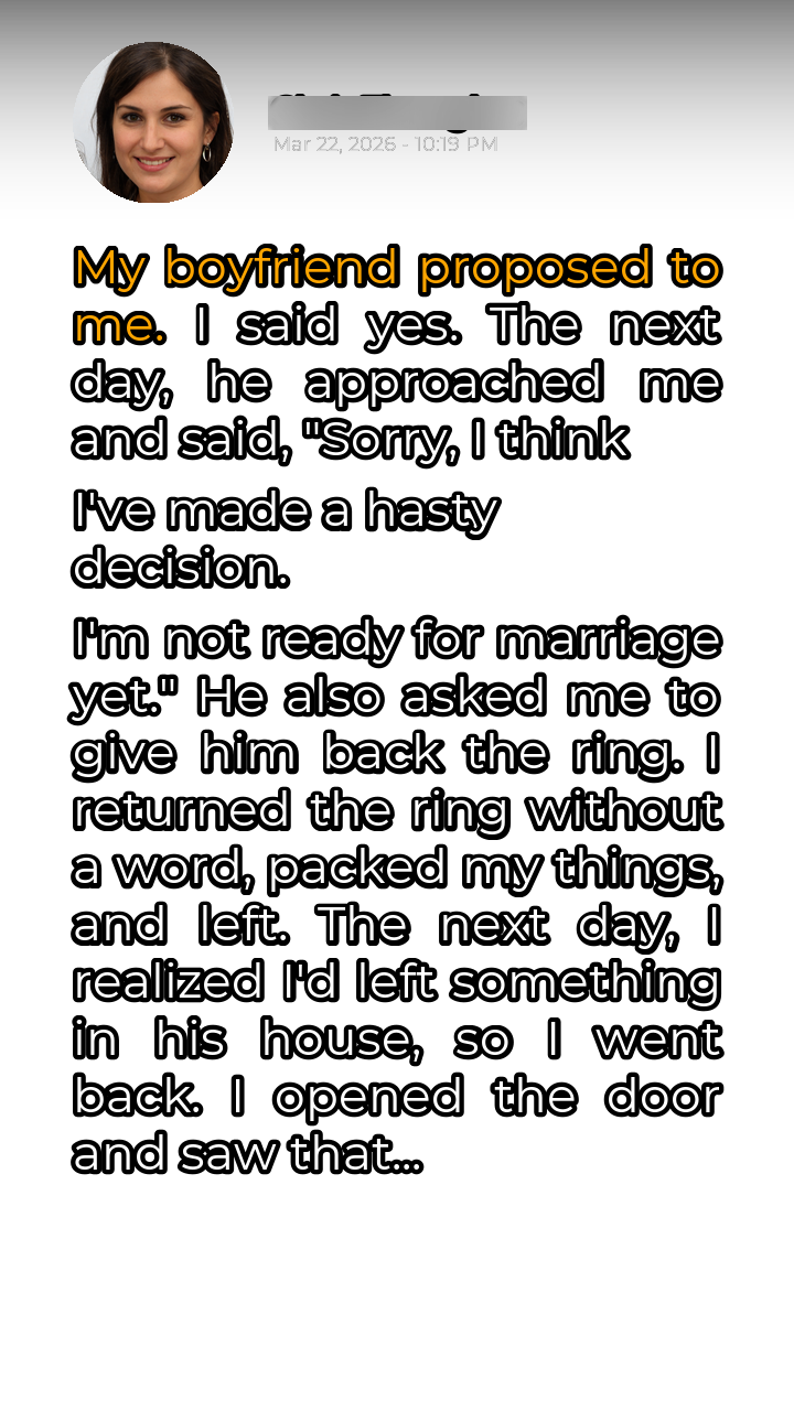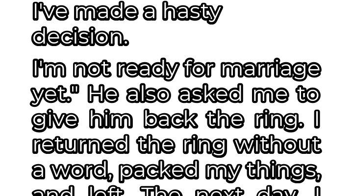 The world seemed to tilt on its axis the moment he slipped the ring onto my finger. It was a beautiful, sparkling symbol of our love, a promise of forever. Tears welled in my eyes as I whispered “yes,” my heart overflowing with joy. We spent the rest of the evening celebrating, lost in a bubble of happiness, making plans for our future together. I drifted off to sleep that night with a smile on my face, dreaming of wedding dresses and shared anniversaries. The next morning, I woke up still basking in the glow of our engagement. I made breakfast, humming a happy tune, eager to start planning our big day. But as he walked into the kitchen, his face was etched with a seriousness that immediately extinguished my joy. He sat me down, his voice heavy with a regret that sliced through me like a knife. He stammered, unable to meet my gaze, before finally uttering the words that would shatter my world: “I think I made a hasty decision. I’m not ready for marriage yet.”