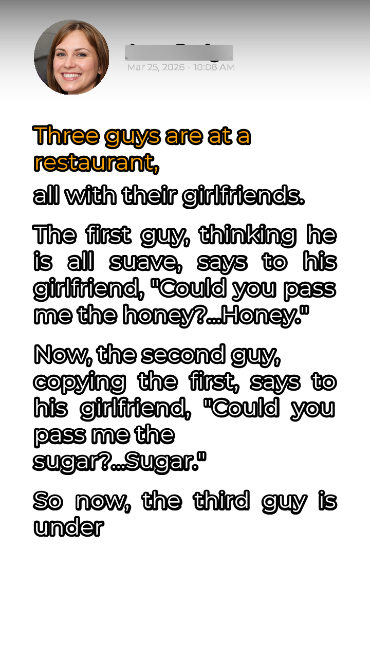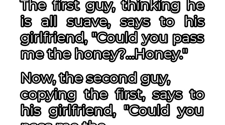 The aroma of freshly baked bread and simmering sauces hung heavy in the air, a comforting blanket over the bustling Italian restaurant. Three couples, friends since college, were enjoying a rare night out, a chance to unwind and reconnect amidst the chaos of their increasingly demanding lives. The conversation flowed easily, punctuated by laughter and the clinking of silverware against ceramic. Mark, ever the self-proclaimed charmer of the group, decided to inject a little playful romance into the evening. With a sly wink at his girlfriend, Sarah, he smoothly requested, “Could you pass me the honey?…Honey.” Sarah, used to Mark’s theatrics, rolled her eyes playfully but obliged, a small smile gracing her lips. The others chuckled, amused by Mark’s blatant attempt at flattery.