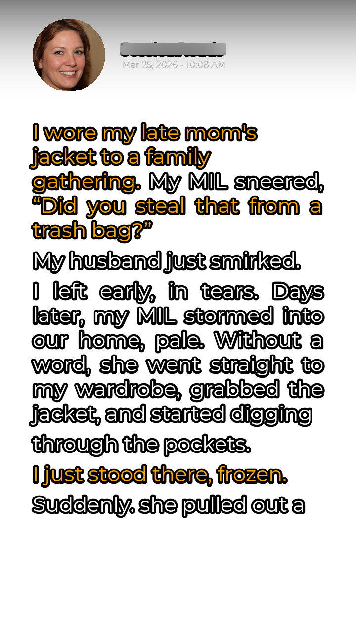 A wave of nausea washed over me. The cruel comment she’d made at the gathering, the smirk on my husband’s face – it all suddenly clicked into place. They knew something. They had been hiding something. And the jacket, the innocent garment I had worn to feel closer to my mother, was the key to unlocking a secret that threatened to shatter everything. I had to know the truth. “What is this, Carol? What were you and my mother to each other?”