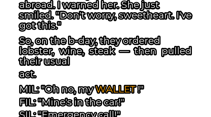 Then, as the bill arrived, the predictable charade began. My mother-in-law clutched her purse in mock horror, exclaiming, “Oh no, my wallet! I must have left it at home!” My father-in-law followed suit, feigning a frantic pat-down of his pockets. “Mine’s in the car,” he declared, making no move to retrieve it. And my sister-in-law, ever the opportunist, announced, “Oh dear, I just received an emergency call! I must take this outside.” With practiced precision, they all vanished, leaving my mom alone with the hefty bill.