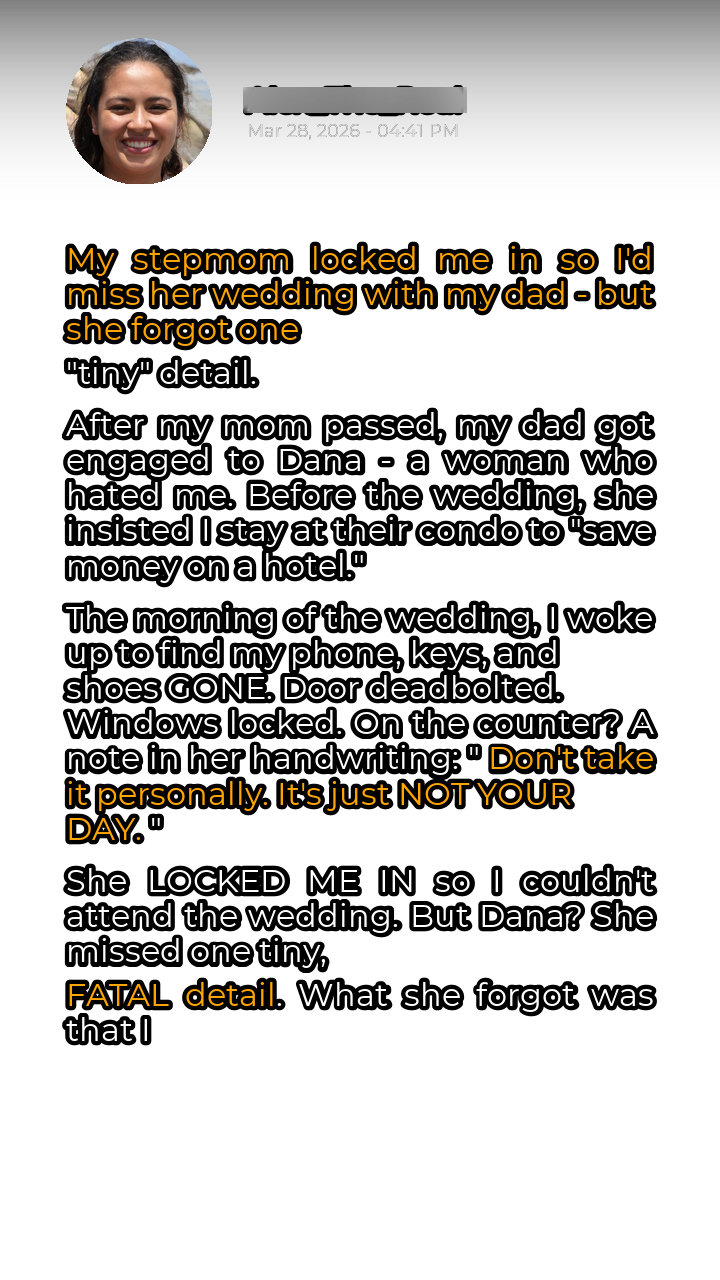 But I wasn’t just going to attend the wedding. I was going to expose Dana for the manipulative, vindictive person she truly was. I knew my dad was blinded by her charm, still grieving my mother and desperate for companionship. He needed to see her true colors before he made the biggest mistake of his life. The wedding was at a fancy hotel downtown. I knew I had to get there fast.