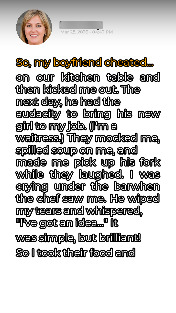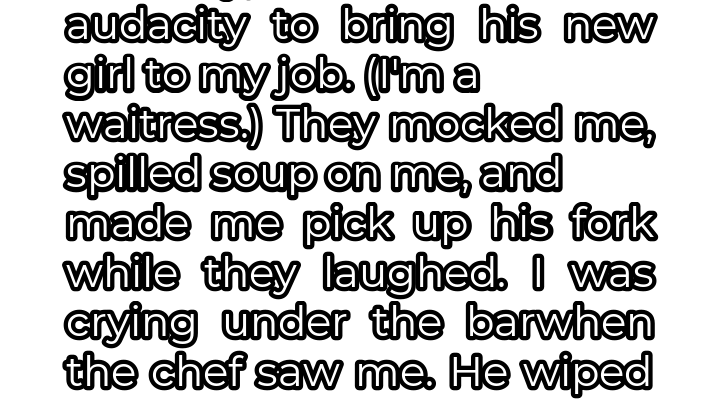 [TITLE] He Cheated On Me, So I Served Him Revenge… Cold. [/TITLE] [IMAGE_TEXT] **Ever felt like your world was crashing down?** Imagine finding your boyfriend in the most vulnerable place, only to be betrayed in the cruelest way possible. Then, picture this: the audacity of him flaunting his new relationship right in front of you, at your workplace, turning your life into a living hell, and pushing you to the brink of despair. The humiliation was unbearable. Tears streamed down my face as I was forced to endure their taunts and mockery, picking up dropped forks while they reveled in my misery. I thought I had hit rock bottom… until the chef, a silent observer of my suffering, offered a glimmer of hope.