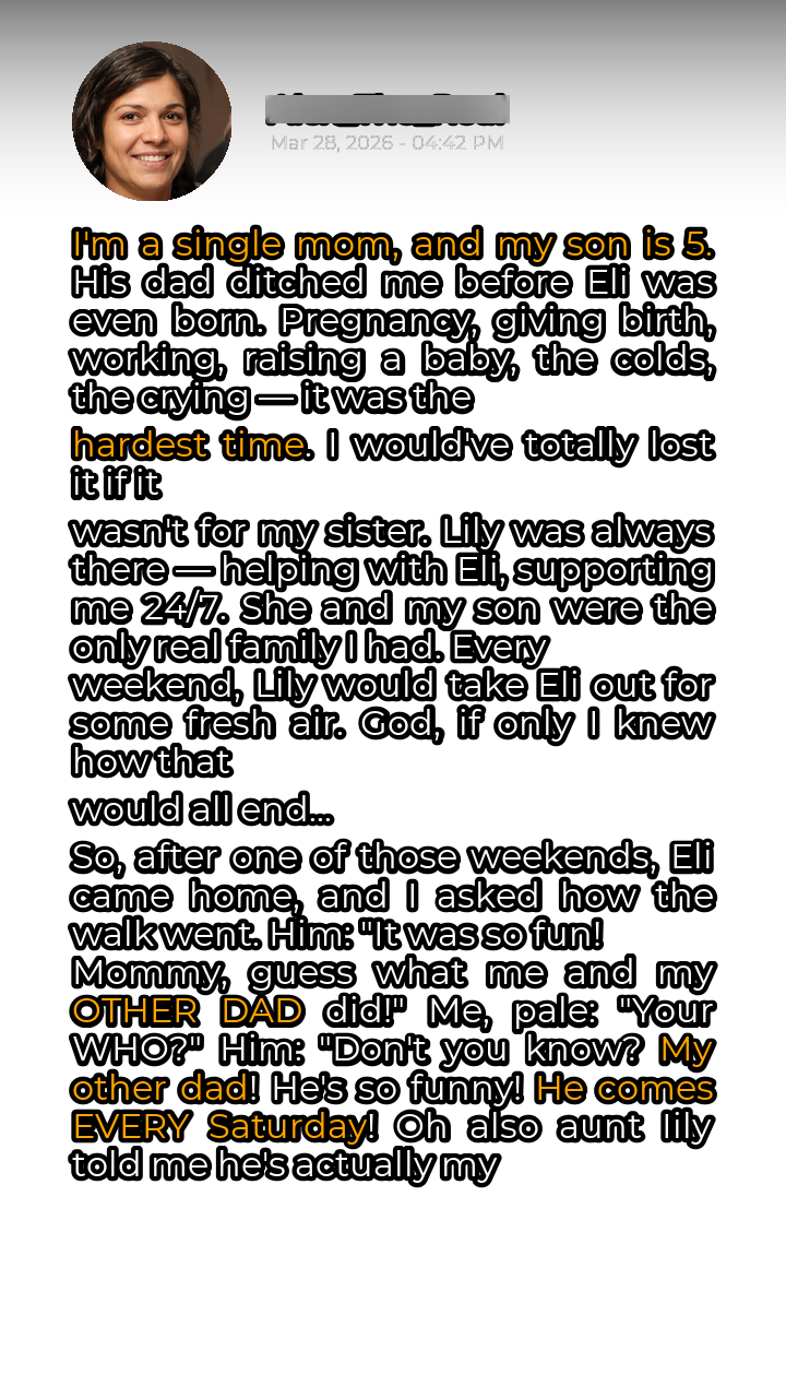 I sent Eli to his room to play and immediately confronted Lily. The truth spilled out in a torrent of tears and justifications. The “other dad” was none other than Mark, my ex-boyfriend from years before Eli was born – and, as Lily confessed, the man she had secretly been in love with all along. She had reconnected with him after Eli’s biological father left, believing that he deserved a chance to be a father and that Eli deserved a father figure. In her twisted logic, she thought she was doing what was best for everyone, even if it meant betraying my trust in the most profound way imaginable. The revelation was devastating, the pain almost unbearable. The sister I loved, the confidante I relied on, had not only deceived me but had also rewritten the narrative of my life, inserting a character I never authorized and creating a reality I never wanted. The future stretched before me, uncertain and irrevocably changed.