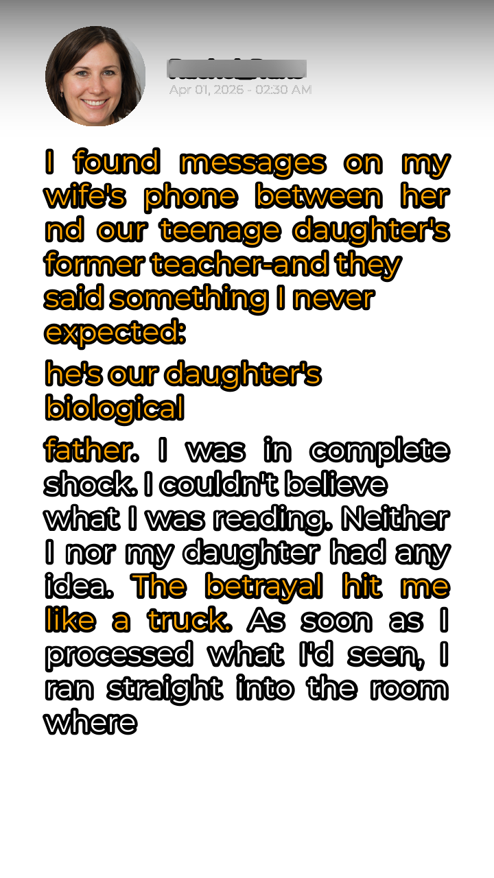 The weight of the phone felt unbearable in my hand. The screen illuminated the terrible truth: my wife, Sarah, had been having an affair with Mark, our daughter Emily’s former high school teacher. But that wasn’t even the worst of it. The messages revealed something far more sinister, a secret that would irrevocably change our family forever. Mark wasn’t just an ex-lover; he was Emily’s biological father. My legs felt like lead as I re-read the messages, desperately hoping it was some kind of sick joke. But the words remained, stark and undeniable. Sarah’s carefully constructed facade of a happy marriage crumbled before my eyes, replaced by the horrifying image of her deceit. Emily, my bright, talented, beautiful daughter, was the product of a betrayal so profound it defied comprehension. I had raised her, loved her, cherished her as my own since the day she was born. How could Sarah do this? How could she let me believe that Emily was mine?