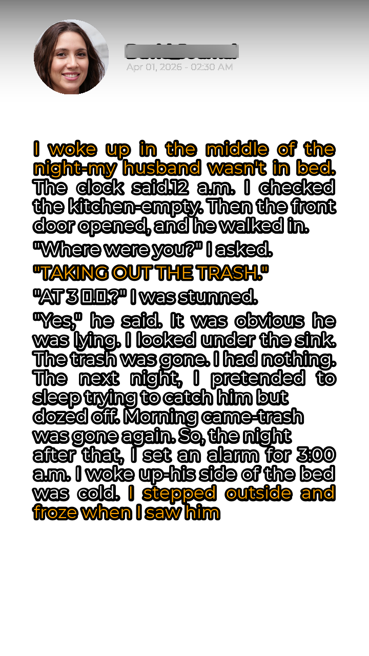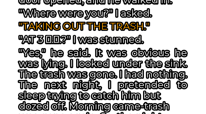 The chill of the empty space beside me jolted me awake. It was 3:00 AM, according to the digital clock glowing faintly on the nightstand. My husband, Mark, wasn’t there. A familiar knot of anxiety tightened in my stomach. It had been happening for weeks. He’d slip out of bed in the dead of night, offering the same, ridiculous excuse: “Taking out the trash.” At 3:00 AM? It defied all logic. The first time it happened, I’d dismissed it as a strange quirk, a one-off. But then it became a pattern. The nights blurred together, each punctuated by his stealthy departure and the lingering scent of deception. I tried to confront him, but he’d deflect my questions with practiced ease, his eyes never quite meeting mine. The trash can under the sink was always mysteriously empty in the morning, further fueling my suspicion.