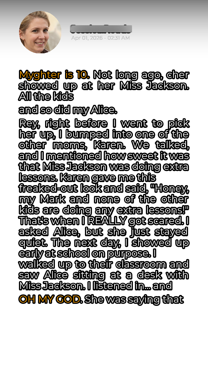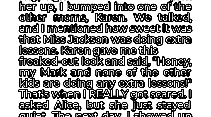 Myghter, my bright and bubbly 10-year-old, had always loved school. So, when she started raving about Miss Jackson, her new teacher, I was thrilled. Miss Jackson seemed dedicated, always going the extra mile. She offered extra lessons after school, which Myghter eagerly signed up for. Alice, my youngest, looked up to her sister and was always excited to hear about these extra sessions. Life felt good, settled, and safe. Or so I thought. The first flicker of unease came during a casual conversation at the grocery store. I ran into Karen, another mom from Myghter’s class. We chatted about the usual school stuff, and I mentioned how impressed I was with Miss Jackson’s dedication to the extra lessons. Karen’s face instantly paled. She looked at me with a mixture of confusion and concern. “Extra lessons?” she asked, her voice barely a whisper. “Honey, my Mark isn’t doing any extra lessons. Neither are any of the other kids that I know of.”