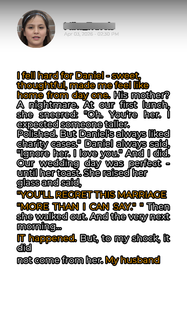 The reception was a joyous blur of dancing, laughter, and heartfelt speeches. Until Eleanor took the microphone for her toast. A hush fell over the room as she raised her glass, her eyes glinting with something that looked suspiciously like malice. “To Daniel and…his bride,” she began, her voice dripping with venom. “You’ll regret this marriage more than I can say.” And with that, she slammed her glass down on the table and stormed out of the room, leaving a stunned silence in her wake.