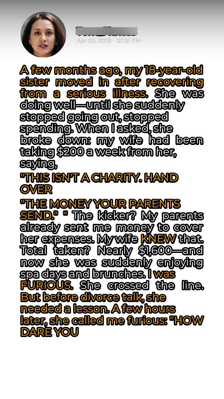 One evening, I found Sarah crying in her room. When I pressed her to tell me what was wrong, she broke down completely. Between sobs, she confessed that Emily had been demanding $200 a week from her, claiming it was “rent” and that Sarah was “taking advantage” of our hospitality. Emily had coldly stated, “THIS ISN’T A CHARITY. HAND OVER THE MONEY YOUR PARENTS SEND.”
