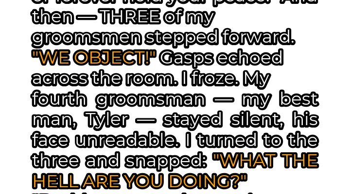 And then it happened. Three of my groomsmen, Mark, David, and Kevin, stepped forward, their faces grim and determined. “WE OBJECT!” they declared in unison, their voices echoing through the shocked silence of the chapel. Gasps rippled through the assembled guests, a wave of disbelief and confusion washing over the room. I froze, my mind reeling, unable to comprehend the sudden and unexpected turn of events. What was happening? Why were my friends, the men I trusted, trying to sabotage my wedding?