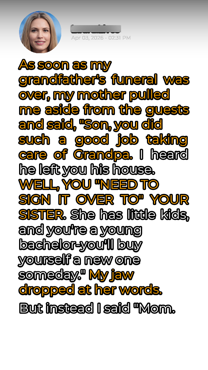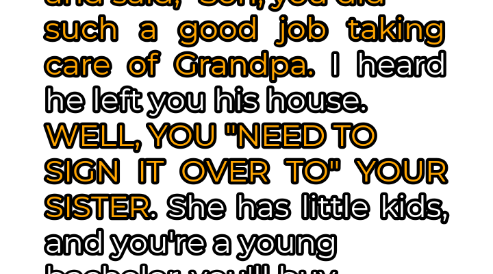 The silence after my mother’s pronouncement was deafening. The gentle hum of the refrigerator in the background suddenly amplified, each cycle a mocking reminder of the normalcy she was trying to impose on this utterly abnormal situation. “Mom,” I managed, my voice barely a whisper, “Grandpa just passed away. Can’t we talk about this later?” I needed time to process, time to grieve, time to understand the sheer audacity of her request. But she was insistent, her eyes fixed on mine with an unnerving intensity. She launched into a well-rehearsed speech about family, about responsibility, about the sacrifices she’d made over the years. My sister, apparently, was struggling. The kids needed a stable home, and a house from Grandpa would solve everything. Never mind that I had my own life, my own dreams, and that Grandpa, in his will, had specifically chosen me as the recipient of his beloved home. Was this about my sister? Or was it about her?