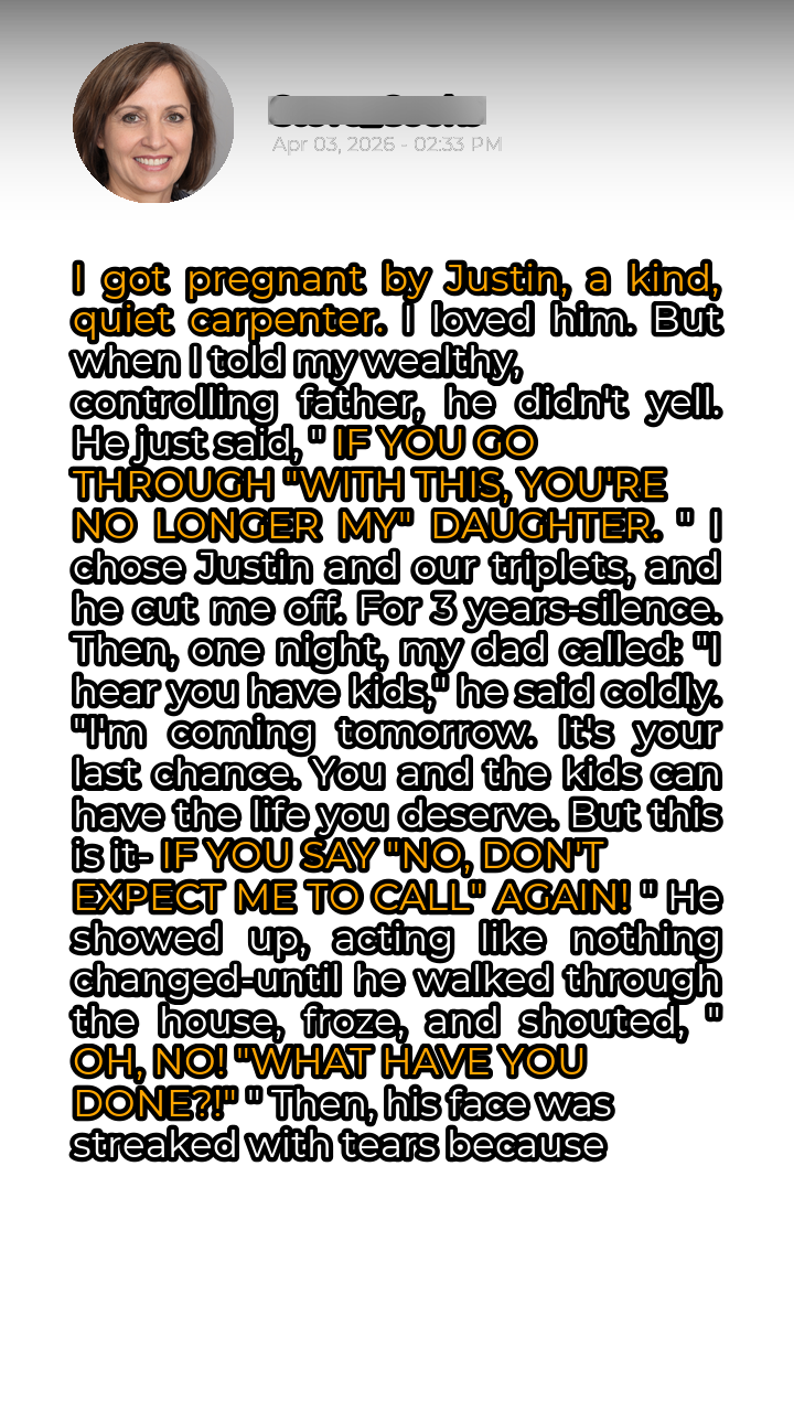 My life had always been meticulously planned, orchestrated by my father, a man whose wealth was only surpassed by his controlling nature. Every school, every friend, every aspiration was carefully curated to fit his vision of success. So, when I fell in love with Justin, a kind and quiet carpenter with calloused hands and a gentle smile, it was an act of rebellion I hadn’t even realized I was capable of. Justin wasn’t part of the plan. He was real, genuine, and he saw me for who I was, not who my father wanted me to be. The news of my pregnancy, let alone triplets, was met with icy fury. My father saw it as a betrayal, a stain on his perfect legacy. He delivered the ultimatum with chilling precision: abandon Justin and the children, and return to his fold, or be banished forever. The choice tore me apart, but in the end, the love I felt for Justin and the tiny lives growing inside me outweighed the allure of wealth and security. I chose them.