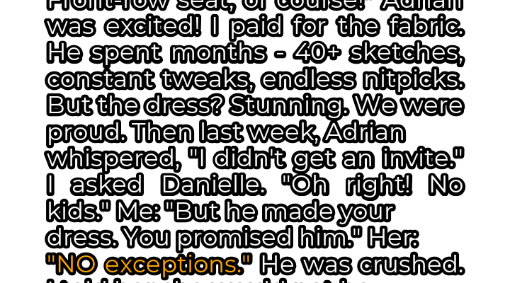 Then came the bombshell. Last week, Adrian, his voice barely a whisper, confessed, “Mom, I didn’t get an invite.” My heart sank. I immediately called Danielle, assuming it was some oversight. “Oh, right!” she chirped, entirely too casually. “No kids at the wedding.” My blood ran cold. “But Danielle,” I stammered, “he *made* your dress! You promised him a front-row seat! He poured his heart and soul into this!” Her response was a callous and dismissive, “NO exceptions.” The words hung in the air, thick with insensitivity.