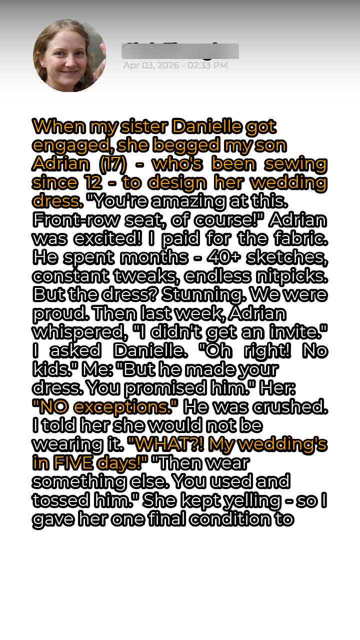 My sister Danielle, ever the whirlwind of drama, got engaged last year. The moment the ring was on her finger, the begging started. She zeroed in on my son, Adrian, a remarkably talented 17-year-old who’s been sewing since he was twelve. “Adrian, please, you *have* to design my wedding dress! You’re absolutely amazing at this! And of course,” she gushed, “front-row seat, guaranteed!” Adrian, usually reserved, was practically glowing with excitement. He poured over bridal magazines, sketching ideas in his notebook late into the night. I, seeing his passion and wanting to support his budding talent, happily covered the cost of the fabric – a luxurious ivory silk that felt like liquid moonlight.