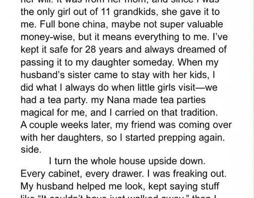 Then, while he stepped away to take a call, I overheard something that changed everything. His sister had taken the tea set “to give it to her daughter” because she thought it “deserved to be used.” My heart ached. It wasn’t the object — it was the meaning behind it.