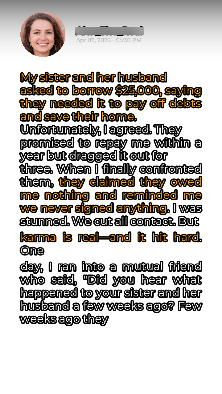 The weight of the unacknowledged debt had hung over me for years, a constant reminder of my naivete and their blatant dishonesty. The $25,000 wasn’t just money; it represented my trust, my willingness to help family in need. To have that trust so callously betrayed left a wound that time seemed unable to heal. I tried to move on, focusing on my own life and building a wall around my heart, determined not to be so vulnerable again. The silence between us was deafening, a chasm that seemed impossible to bridge. Birthdays, holidays, even family emergencies passed without a word exchanged. The sister I once knew was gone, replaced by a stranger who had chosen money over our bond.