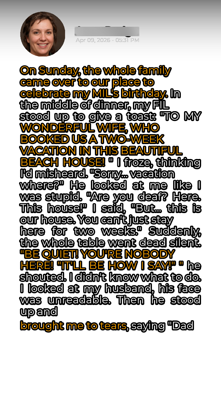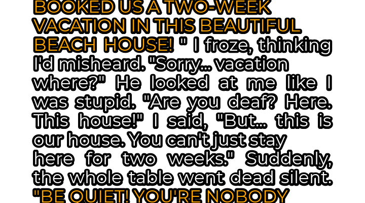 The aroma of roasted chicken and freshly baked bread, once comforting, now felt suffocating. On Sunday, the entire family had gathered at our home, a charming beach house nestled along the coastline, to celebrate my mother-in-law’s birthday. The afternoon had been filled with the usual familial chatter, lighthearted jokes, and the anticipation of a delicious meal. Little did I know, the idyllic setting was about to become the stage for a drama I could never have anticipated. As we settled around the large dining table, laughter filled the air. My father-in-law, a man known for his boisterous personality and occasional grand gestures, stood up, a glass of wine in his hand. He cleared his throat, a mischievous glint in his eyes, and began his toast. “To my wonderful wife,” he proclaimed, his voice booming, “who booked us a two-week vacation in this beautiful beach house!”