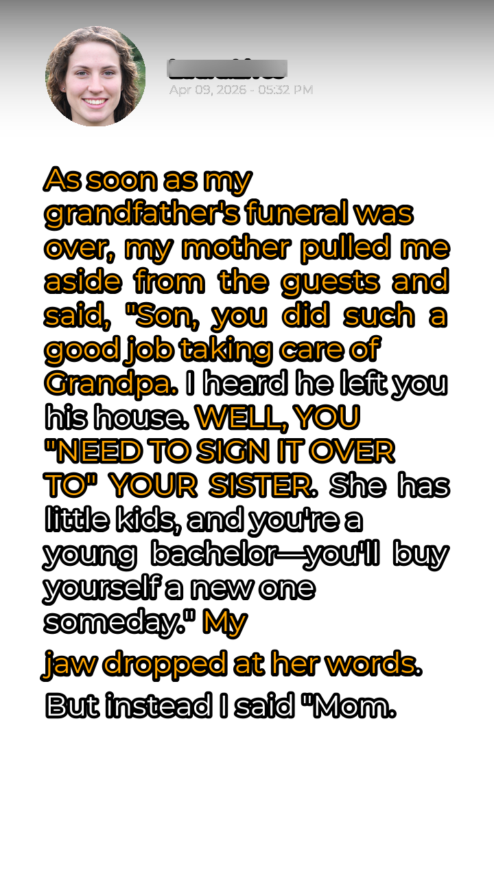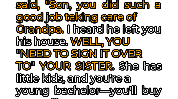 “Mom, I appreciate your concern for Sarah, but this isn’t about that. This is about Grandpa’s wishes, and this is about what I want. I’m not signing the house over.” I tried to keep my voice firm, but the tremor of hurt and anger was undeniable.