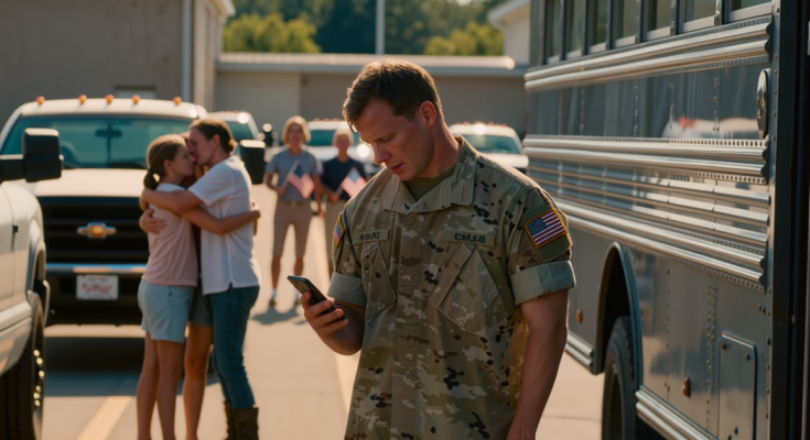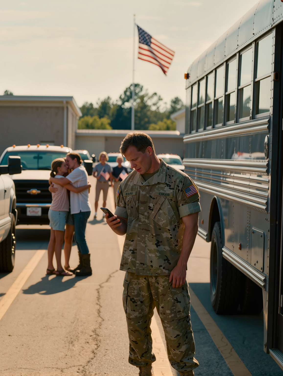 He stood motionless in the sweltering Georgia heat, the runway shimmering, the American flag snapping above the base gate in the distance. Fellow soldiers streamed past him toward their own homecoming celebrations—wives running into arms, kids waving homemade signs, parents crying into uniforms.