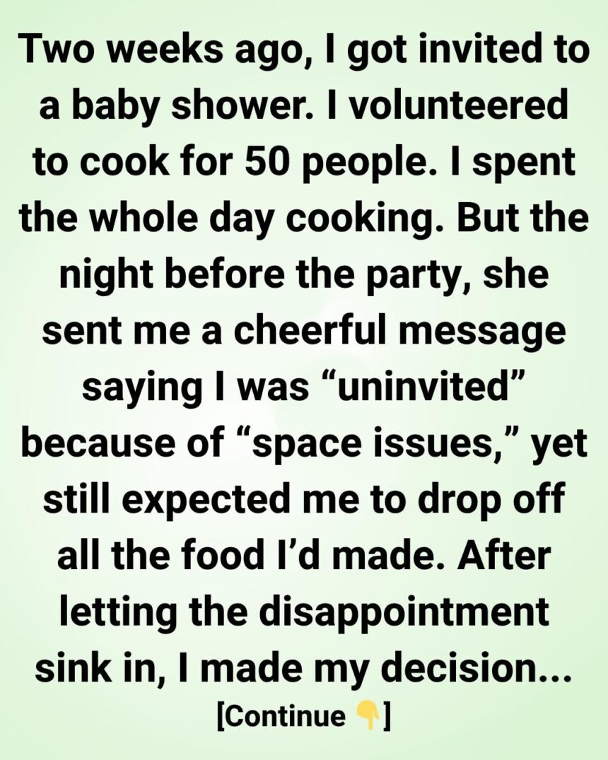 But the night before the event, everything took an unexpected turn. The host sent me a cheerful message saying I was “uninvited” due to “space issues.” Yet, she still wanted me to drop off all the food. No apology, no explanation — just casual instructions, as though my time and care were hers to command.