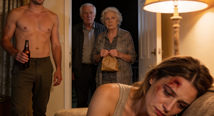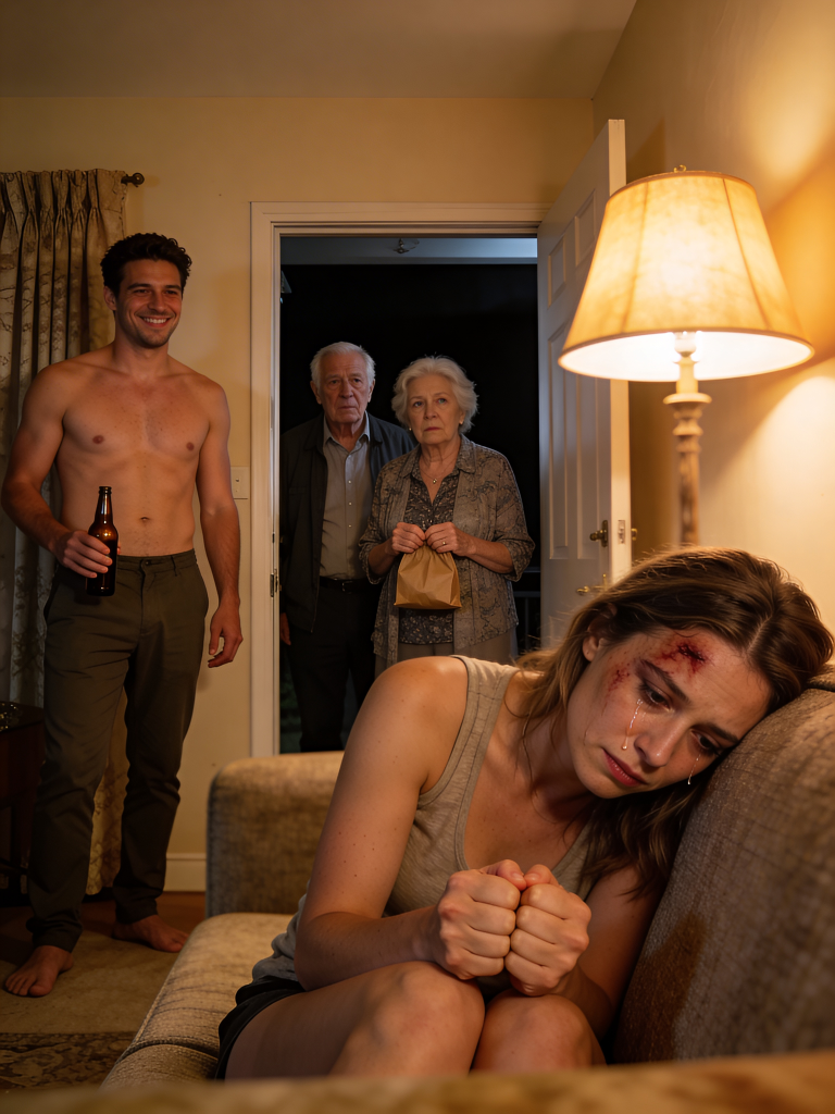 My mother Linda stepped through the front door carrying two paper bags fragrant with steam and gravy, her expression softened by habitual affection, while my father Harold followed closely behind, his posture relaxed, unaware that this ordinary visit would fracture illusions none of us fully understood. Evan lounged comfortably in his recliner near the television, shirt loose, beer balanced lazily in his hand, his casual indifference radiating a confidence born from certainty that silence would once again protect him.