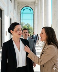 A lawyer holding a coffee paused with the cup half-raised. A court clerk froze mid-step. Even the ceiling lights felt too bright suddenly, as if the building itself wanted to witness.