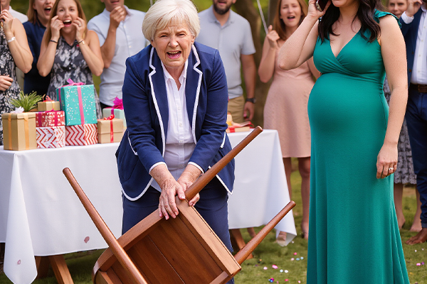 The party was reaching its peak when a delivery man appeared with a giant golden basket wrapped in shimmering plastic. It sparkled under the sun like something out of a commercial — designer baby clothes, silver rattles, monogrammed blankets. The card read: With love, Sophia.