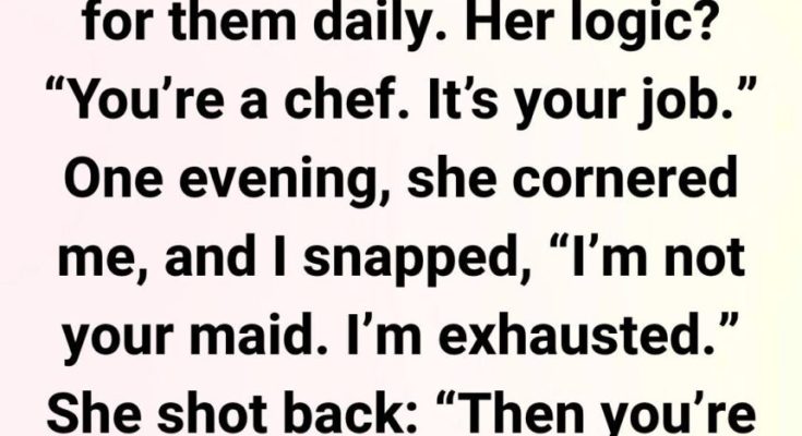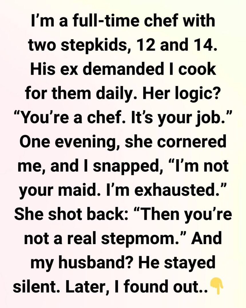 No one asked anymore; they just assumed I’d cook every meal. Then my husband’s ex-wife started getting involved. She demanded that I cook for the kids every single day, saying, “You’re a chef.