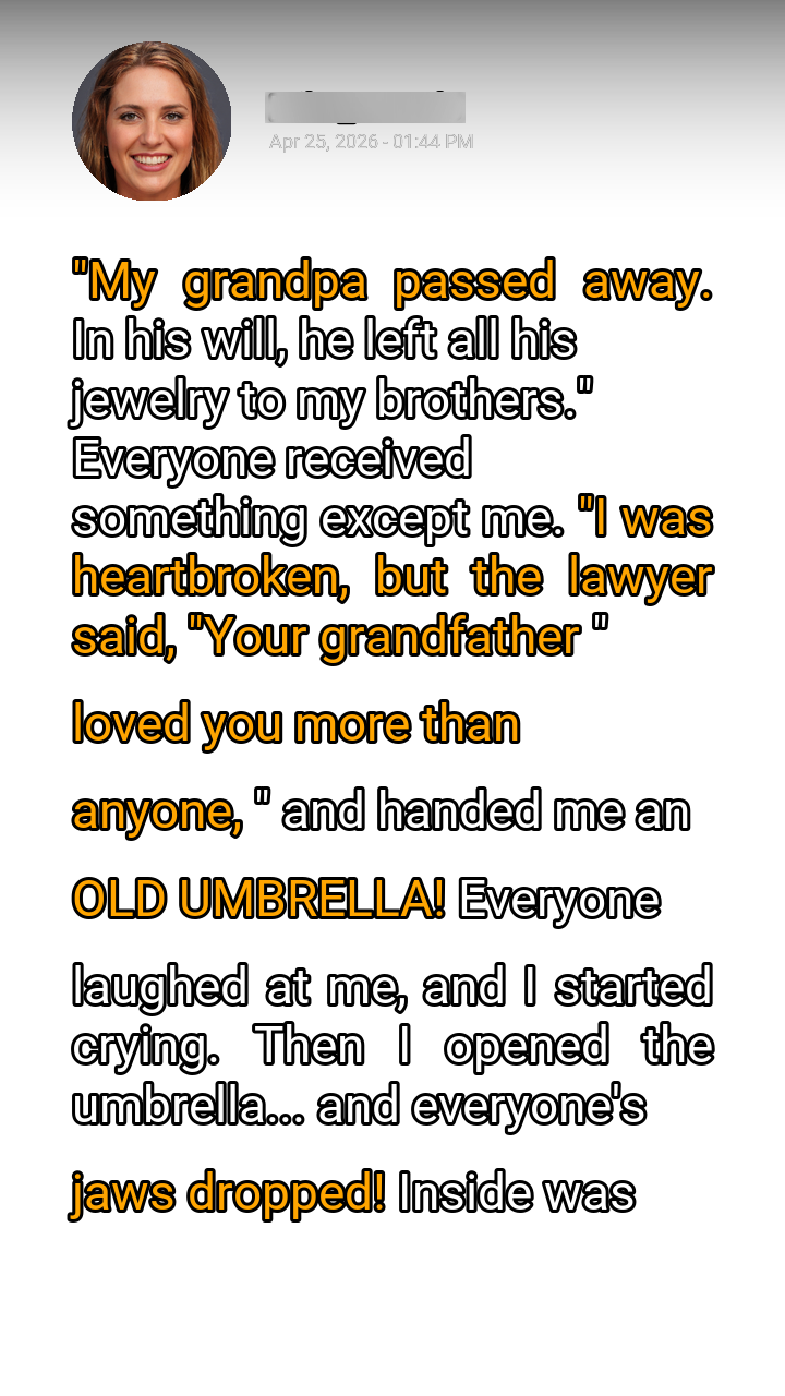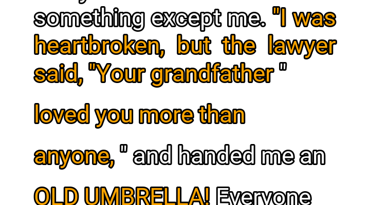 My head snapped up, a flicker of bewildered hope igniting in my chest. A collective gasp, then a ripple of murmuring, swept through the room. Mark and David glared, their expressions curdling into resentment. “Which is why,” Mr. Abernathy continued, reaching under his desk and producing something that made every jaw in the room slacken, “he left you this.” He placed it on the polished table before me with a soft thud. It wasn’t a rare coin, nor a valuable painting, nor a cryptic map to a hidden fortune. It was an umbrella. Not just any umbrella, but an ancient, decrepit thing. Its wooden handle was chipped and scarred, the once-black canopy faded to a mottled, dusty grey, riddled with small, crudely patched holes. The metal ribs were bent in several places, and a loose thread dangled precariously from one of its tattered edges. It looked like something rescued from a forgotten attic, perhaps discarded by a street vendor decades ago, utterly worthless and absurdly out of place amidst the glittering jewels and polished gold.