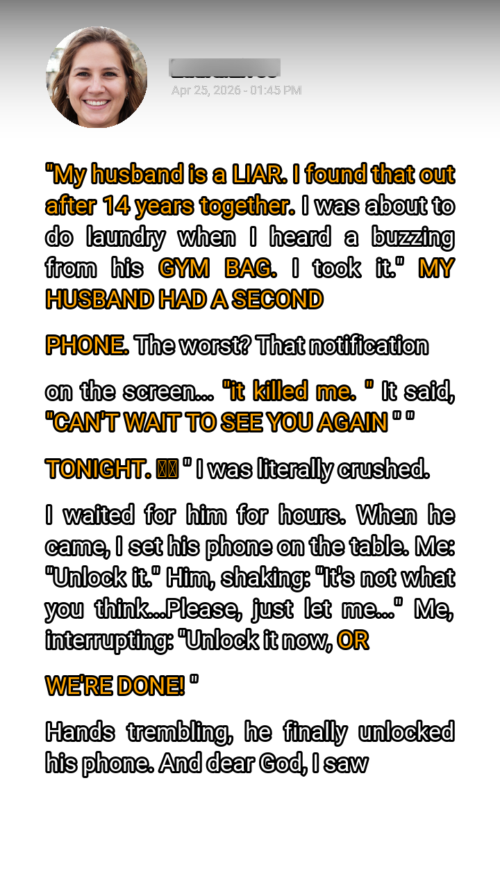 “Mark,” I said, my voice dangerously level, a low thrumming of barely contained fury vibrating beneath the surface. “Unlock it.” The words hung in the air, heavy with unspoken truths, with the weight of our entire shared history teetering on a precipice. He started to shake, a tremor that began in his hands and spread rapidly through his entire frame. “It’s not what you think, Sarah,” he stammered, his voice hoarse, his eyes wide with a desperate, pleading fear. “Please, just let me explain… just give me a chance…” His words were a frantic scramble, a desperate attempt to build a dam against the inevitable flood. But the dam had already broken. My own voice, sharper now, cut through his pathetic plea. “Unlock it now,” I commanded, each word a hammer blow, “OR WE’RE DONE!” His eyes, glazed with terror, met mine, and he must have seen the unyielding finality there. With hands trembling so violently he could barely hold the device steady, he slowly, agonizingly, began to input the passcode. And dear God, I saw…