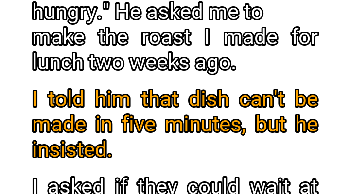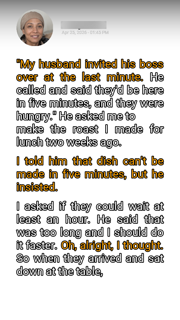 The bombshell dropped with the force of a small meteor. “My boss, Mr. Harrison, he’s just left the office with me. We’re on our way over. He’ll be there in… five minutes! And he’s starving! He specifically mentioned how much he loved that incredible roast you made for lunch two weeks ago. Said he’s been dreaming about it!” My jaw tightened. “Mark,” I began, my voice a carefully controlled calm that masked a rapidly rising tide of incredulity, “that’s a seven-hour dish. You know that. It’s not something you whip up in five minutes, or even an hour. It requires hours of slow cooking, not to mention the prep and marinating time.”