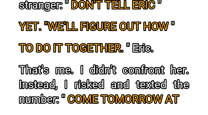 Later that evening, while Claire was in the shower, the sound of the running water muffling any potential noise, I found myself hovering over her phone. My fingers trembled as I picked it up, unlocking it with the fingerprint I had long ago learned to access while she slept. My heart hammered against my ribs, a drumbeat of fear and adrenaline. I navigated to the recent messages, found the unknown number, and with a surge of cold determination, I began to type. Each keystroke was a gamble, a step into the unknown. “**COME TOMORROW AT 7 P.M. ERIC WON’T BE HOME.**” It was a bold, dangerous move, an invitation to the serpent in my own garden. My stomach churned, a volatile mix of terror and a strange, perverse excitement. I deleted the message from her sent items, replaced her phone exactly where it had been, and tried to compose myself before she emerged, oblivious, from the bathroom.