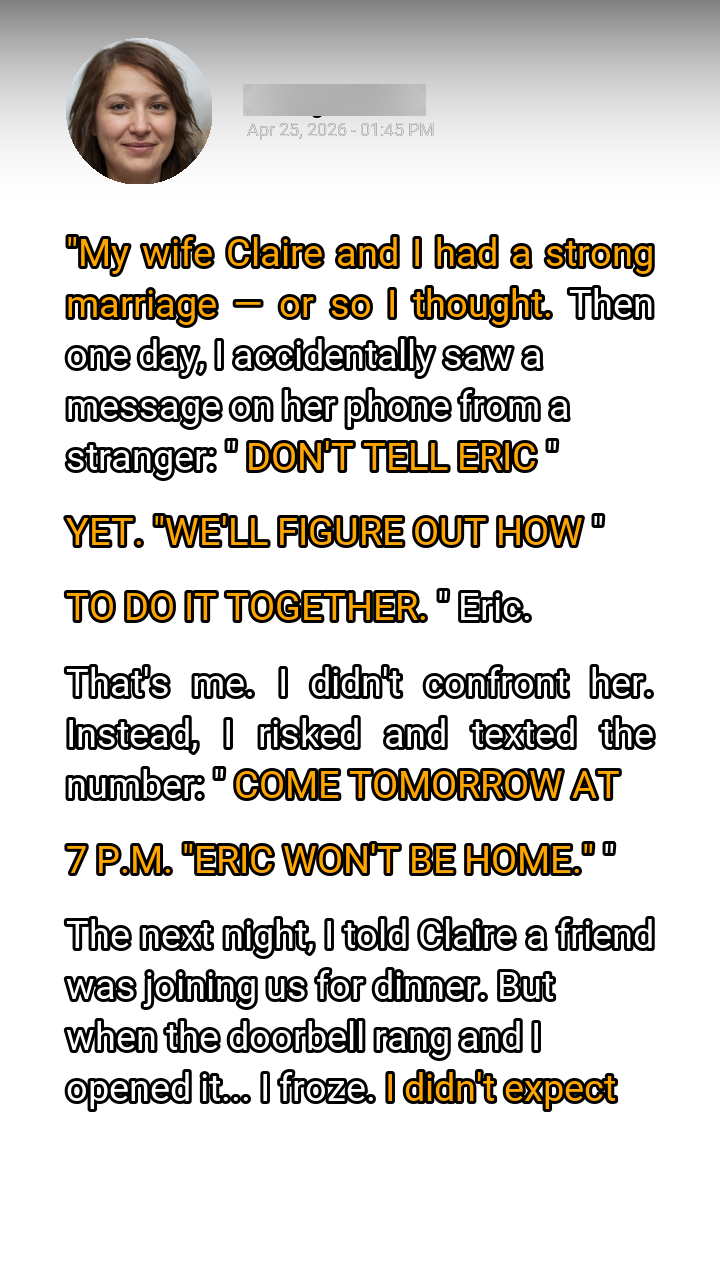 The clock on the kitchen wall ticked with agonizing slowness, each second stretching into an eternity. I kept glancing at it, then at the front door, a knot tightening in my stomach. 6:50 PM. 6:55 PM. Claire was setting the table, humming a cheerful tune. She paused, looking at me with a slight frown. “Are you alright, Eric? You seem a little on edge.” I forced a smile. “Just a long day, honey. Looking forward to relaxing.” The doorbell chose that exact moment to chime, a piercing, insistent sound that shattered the fragile calm of the evening. My breath caught in my throat. This was it. The moment of truth. My heart pounded so violently I thought it might burst through my chest. I walked to the door, my legs feeling like lead, my hand trembling as I reached for the cold brass handle. I took a deep, shuddering breath, braced myself for the confrontation, for the face of the stranger, the accomplice, the betrayer, the person who was conspiring with my wife. I twisted the handle, pulled the door open, and froze. My jaw went slack, my carefully constructed world tilting violently on its axis. I didn’t expect…