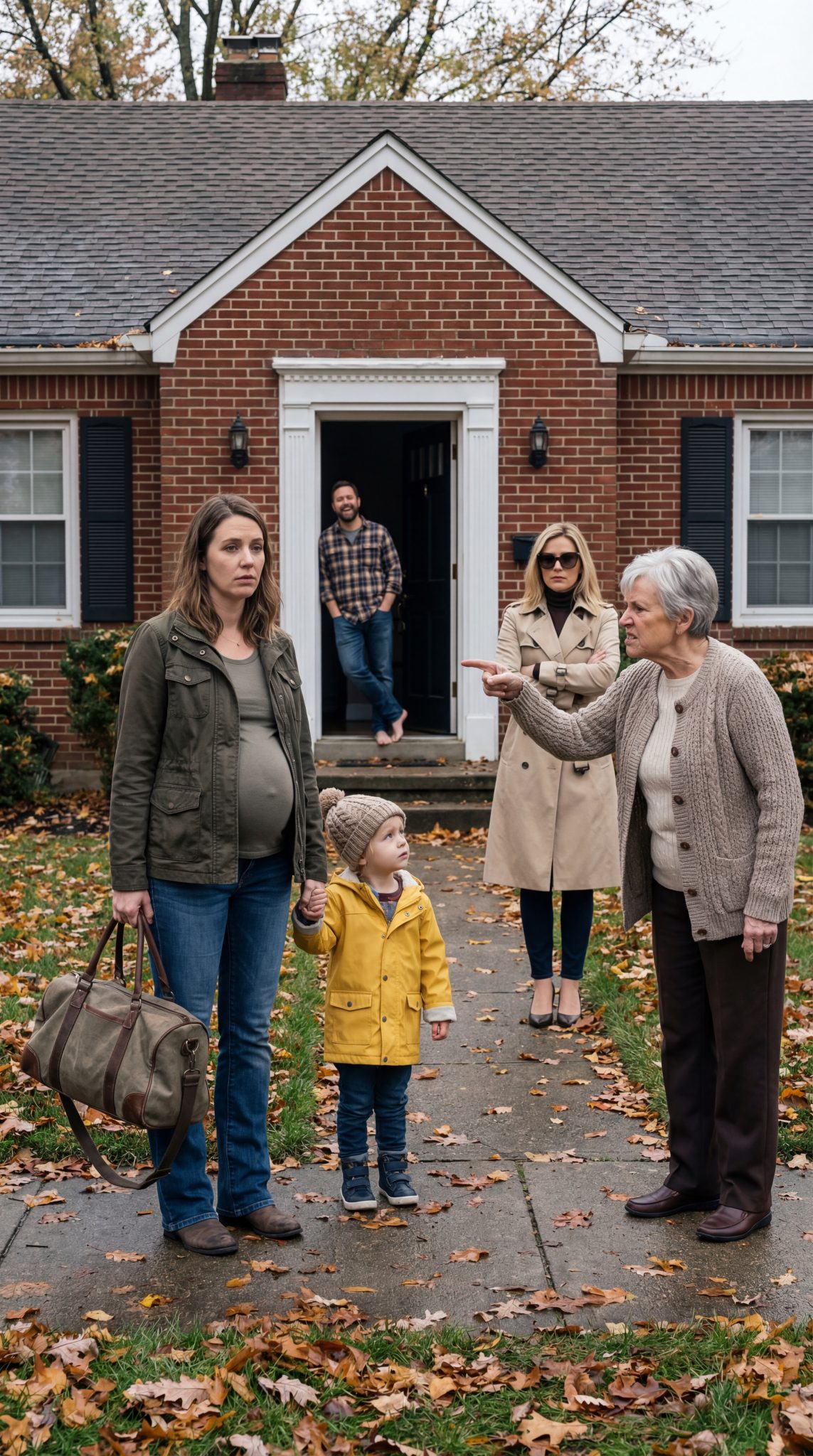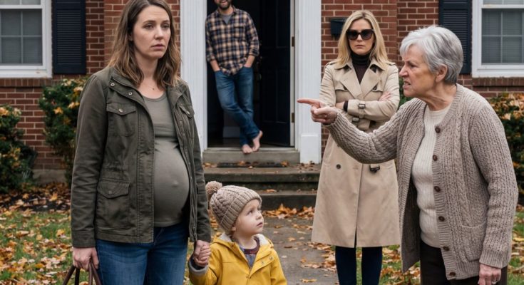 I stood on the porch, my coat stretched tight over my pregnant belly, one hand gripping my three-year-old son’s.